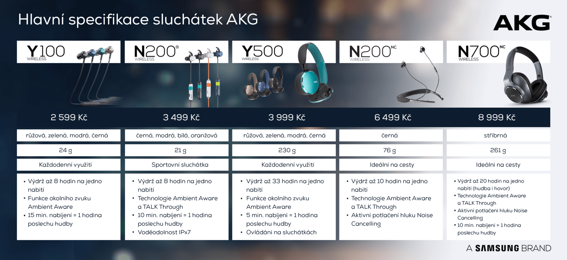 Do střední a vyšší cenové kategorie bezdrátových sluchátek přibyla silná konkurence. Rakouskou značku AKG, působící od roku 2017 jako součást koncernu Samsung, zná český posluchač především jako součást balení vlajkových lodí největšího výrobce mobilních telefonů na světě. Nyní přichází na český trh také samostatně a nabízí hned pětici sluchátek pro náročné uši.
